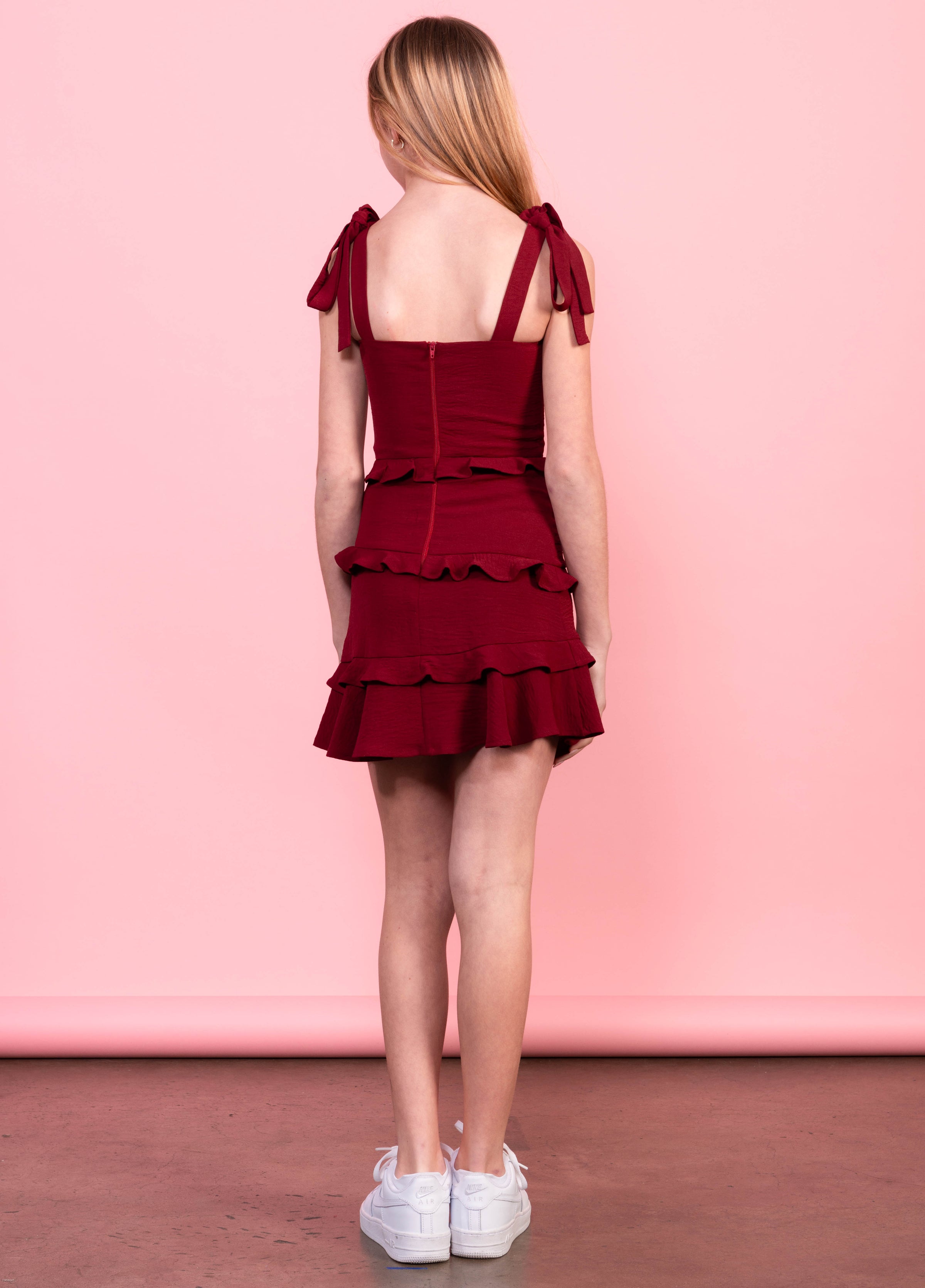 This MEGHAN dress is perfect for tweens, with trendy tie straps and a fitted silhouette. The all over ruffle adds a fun and stylish touch, making it a versatile day to night dress. Look and feel your best with the perfect fit of this dress.