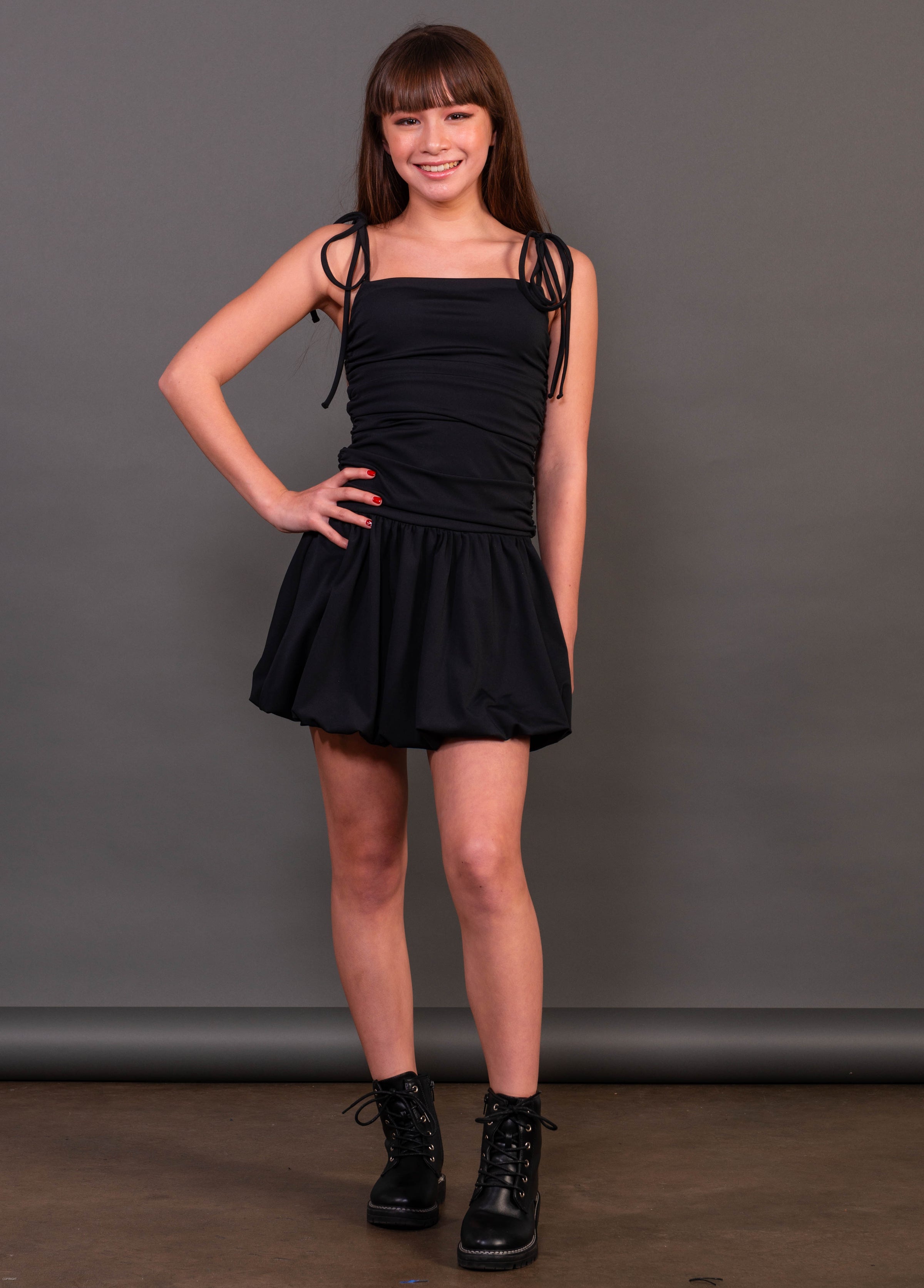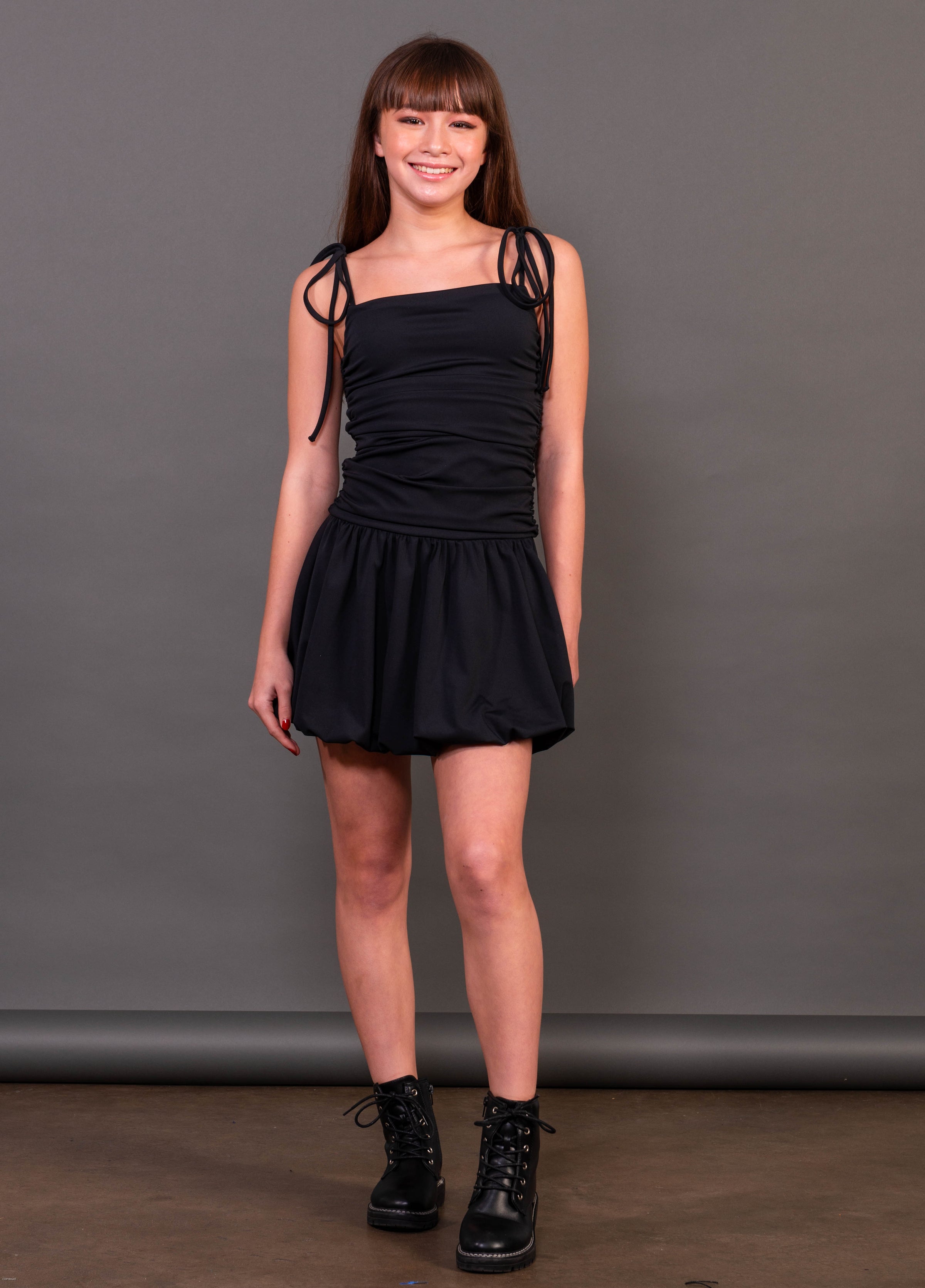 The RUBY Tie Straps Ruched Bubble Dress combines trendy design with comfort, featuring soft, elastic fabric that moves with ease. Its ruched, fitted silhouette and low-waisted bubble shape create a flattering look perfect for tweens and teens heading back to school. Adjustable tie straps add a customizable fit, making this dress both stylish and practical for everyday wear.
